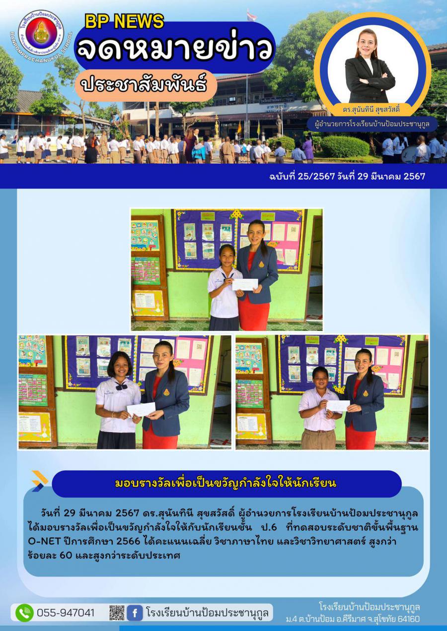 วันที่ 29 มีนาคม 2567 ดร.สุนันทินี สุขสวัสดิ์ ผู้อำนวยการโรงเรียนบ้านป้อมประชานุกูล ได้มอบรางวัลเพื่อเป็นขวัญกำลังให้นักเรียน ป.6 ที่ทดสอบ O-NET ปีการศึกษา 2566 ได้คะแนนเฉลี่ยมีวิชาภาษาไทย และวิชาวิทยาศาสตร์ สูงกว่าร้อยละ 60 และสูงกว่าระดับประเทศ