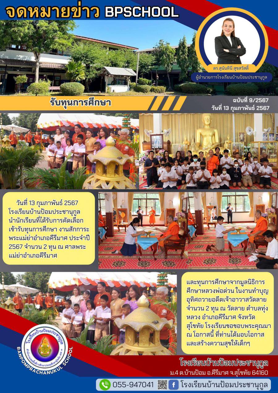 โรงเรียนบ้านป้อมประชานุกูล นำนักเรียนรับทุนการศึกษาพระแม่ย่า งานสักการะพระแม่ย่าอำเภอคีรีมาศ ประจำปี 2567 จำนวน 2 ทุน ณ ศาลพระแม่ย่าอำเภอคีรีมาศ และทุนการศึกษาจากมูลนิธิหลวงพ่อต่วน งานทำบุญอุทิศถวายอดีตเจ้าอาวาสวัดลาย ณ วัดลาย ตำบลทุ่งหลวง อำเภอคีรีมาศ จังหวัดสุโขทัย โรงเรียนขอขอบพระคุณมา ณ โอกาสนี้ ที่ท่านได้มอบโอกาสและสร้างความสุขให้แก่เด็กๆ
