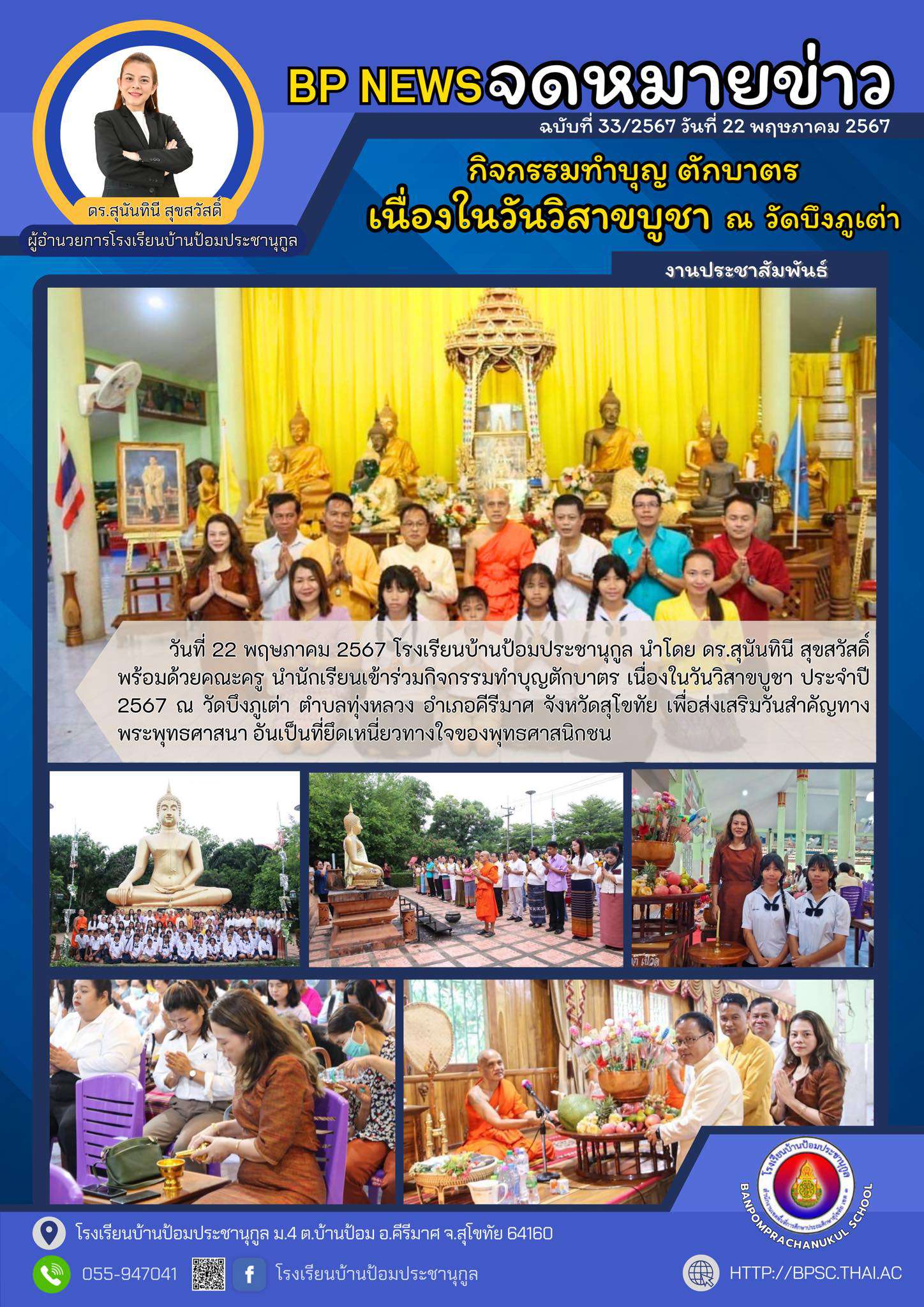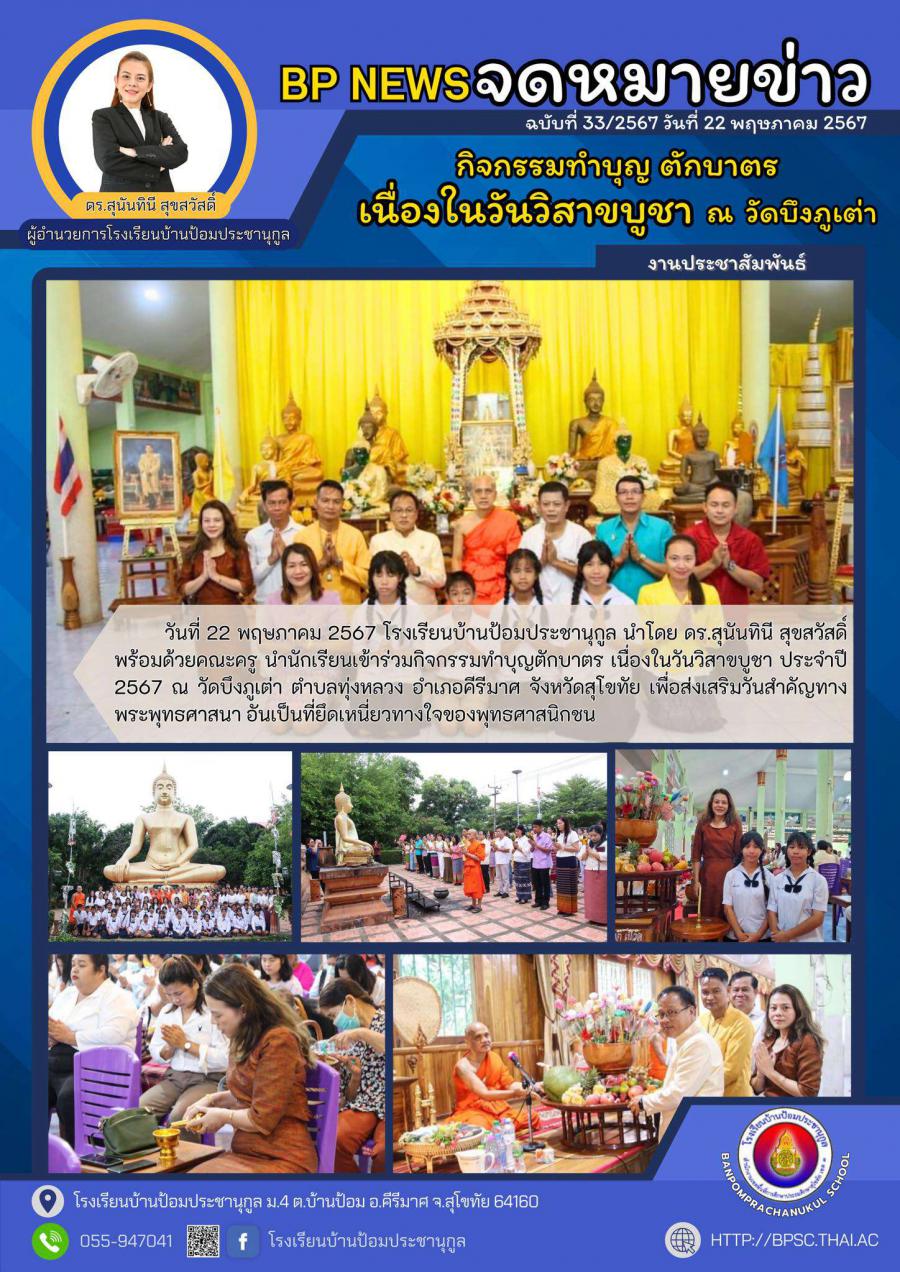 ????โรงเรียนบ้านป้อมประชานุกูล นำโดย ดร.สุนันทินีสุขสวัสดิ์ พร้อมด้วยคณะครู นำนักเรียนเข้าร่วมกิจกรรมทำบุญตักบาตร เนื่องในวันวิสาขบูชา 2567 ณ วัดบึงภูเต่า ต.ทุ่งหลวง อ.คีรีมาศ จ.สุโขทัย เพื่อส่งเสริมวันสำคัญทางพระพุทธศาสนา????????????
