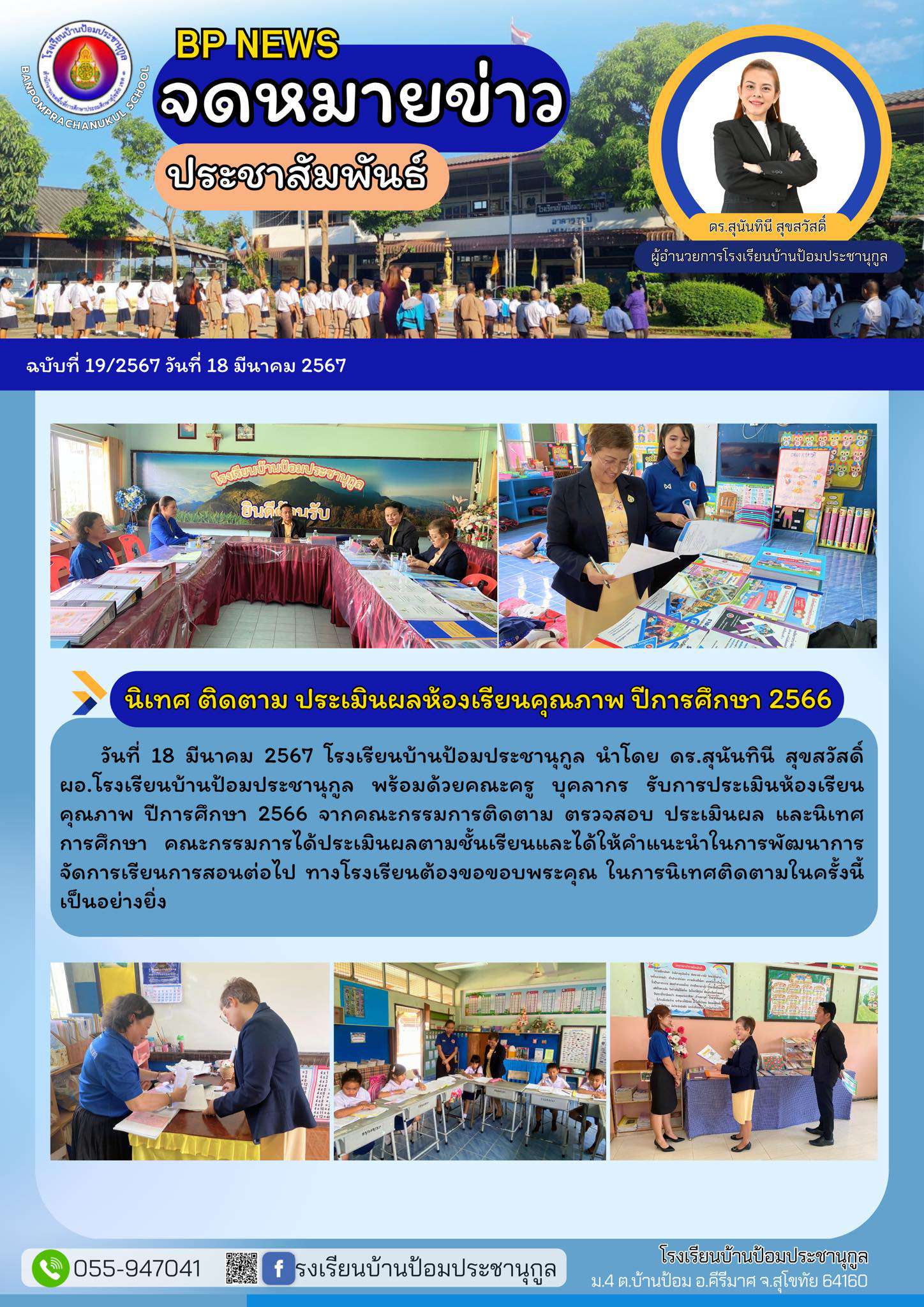 วันที่ 18 มีนาคม 2567 โรงเรียนบ้านป้อมประชานุกูล รับการประเมินห้องเรียนคุณภาพ ปีการศึกษา 2566 จากคณะกรรมการติดตาม ตรวจสอบ ประเมินผล และนิเทศการศึกษา คณะกรรมการได้ประเมินผลตามชั้นเรียน และได้ให้คำแนะนำในการจัดการเรียนการสอนต่อไป โรงเรียนขอขอบพระคุณในการนิเทศติดตามในครั้งนี้เป็นอย่างยิ่ง