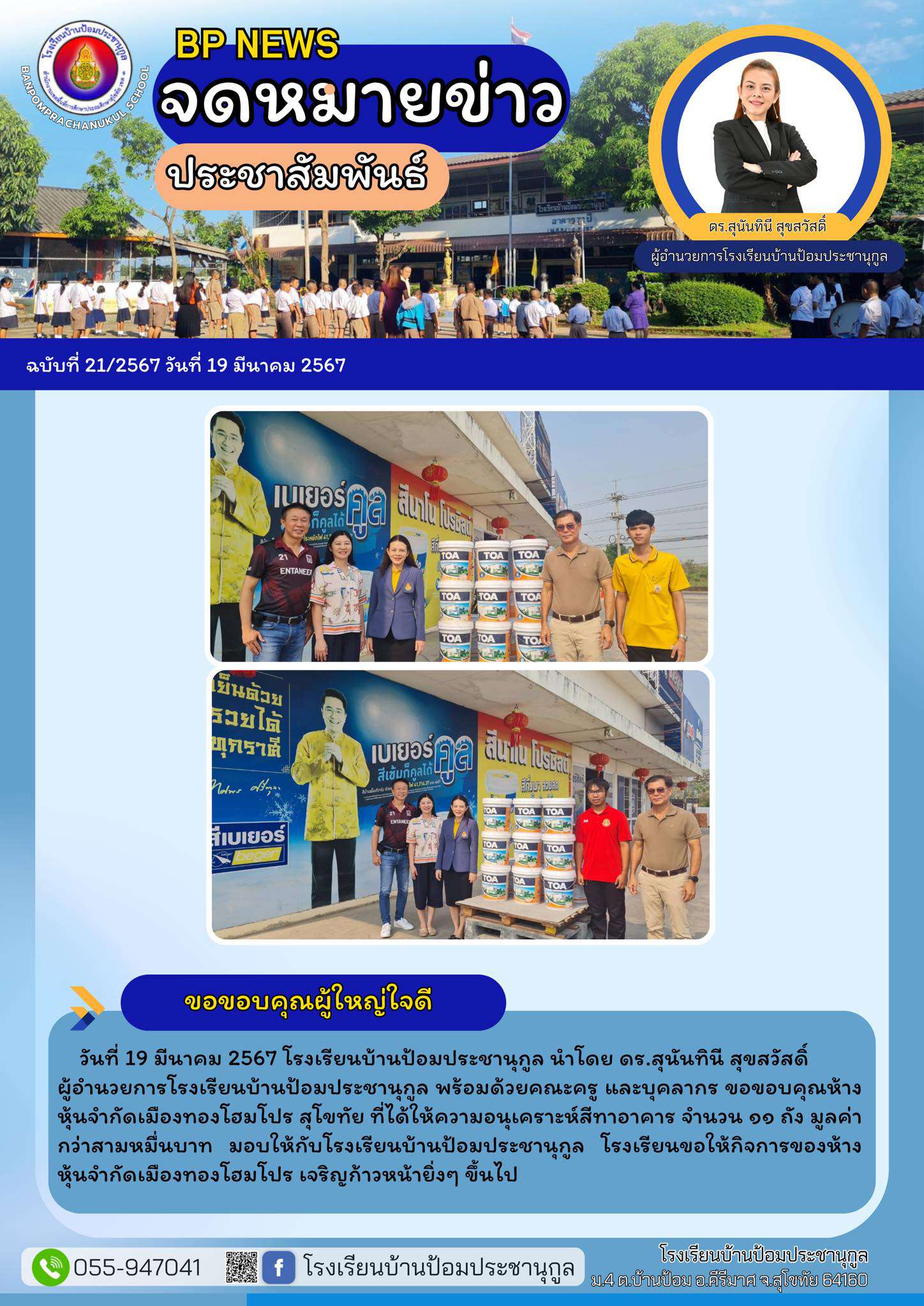 วันที่ 19 มีนาคม 2567 โรงเรียนบ้านป้อมประชานุกูล นำโดย ดร.สุนันทินี สุขสวัสดิ์ ผู้อำนวยการโรงเรียนบ้านป้อมประชานุกูล พร้อมด้วยคณะครู และบุคลากร ขอขอบคุณห้างหุ้นจำกัดเมืองทองโฮมโปร สุโขทัย ที่ได้ให้ความอนุเคราะห์สีทาอาคาร จำนวน ๑๑ ถัง มูลค่ากว่าสามหมื่นบาท มอบให้กับโรงเรียนบ้านป้อมประชานุกูล โรงเรียนขอให้กิจการของห้างหุ้นจำกัดเมืองทองโฮมโปร เจริญก้าวหน้ายิ่งๆ ขึ้นไป
