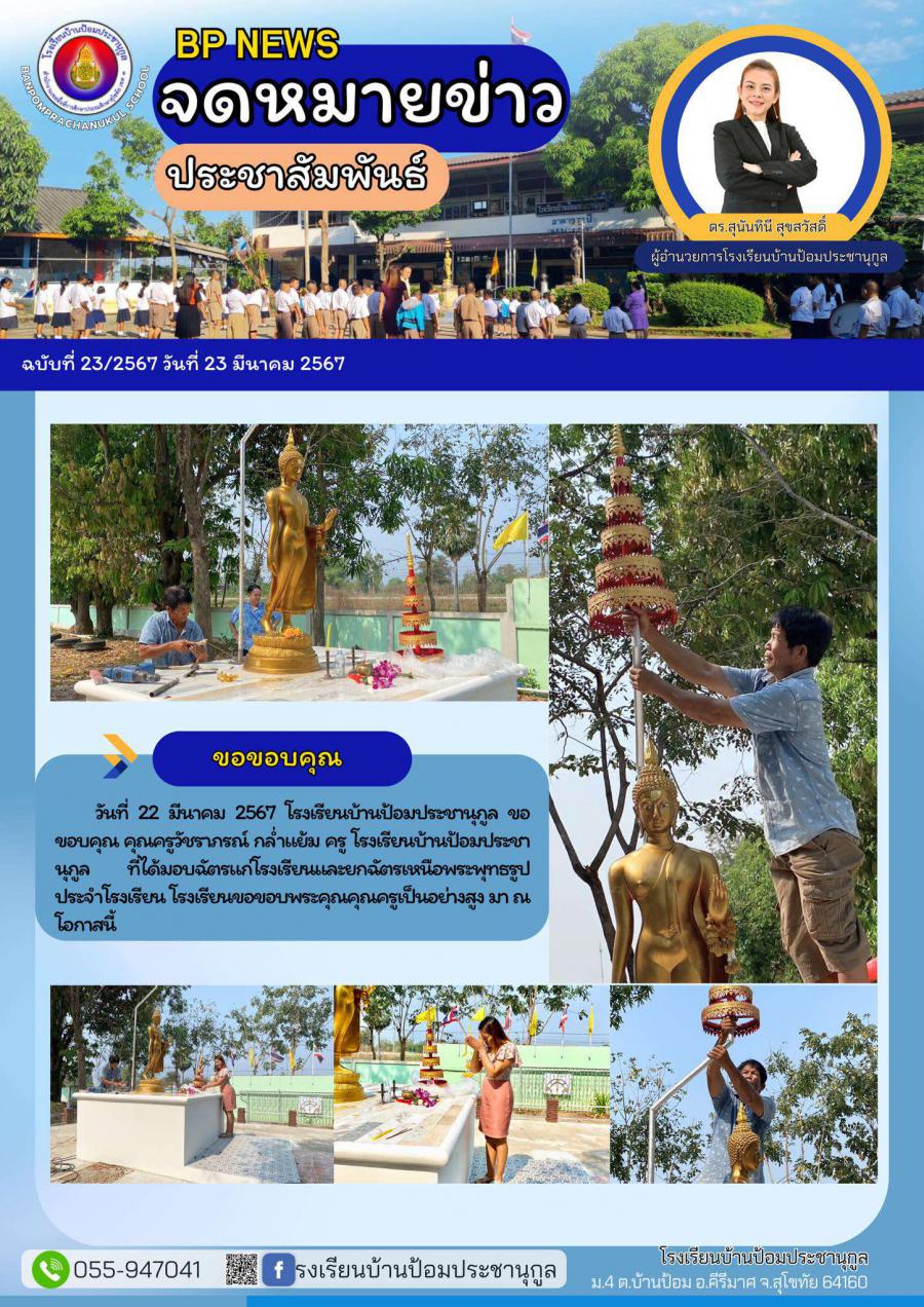 วันที่ 22 มีนาคม 2567 โรงเรียนบ้านป้อมประชานุกูล ขอขอบคุณ คุณครูวัชราภรณ์ กล่ำแย้ม ครู โรงเรียนบ้านป้อมประชานุกูล ที่ได้มอบฉัตรแก่โรงเรียนและยกฉัตรเหนือพระพุทธรูปประจำโรงเรียน โรงเรียนขอขอบพระคุณคุณครูเป็นอย่างสูง มา ณ โอกาสนี้