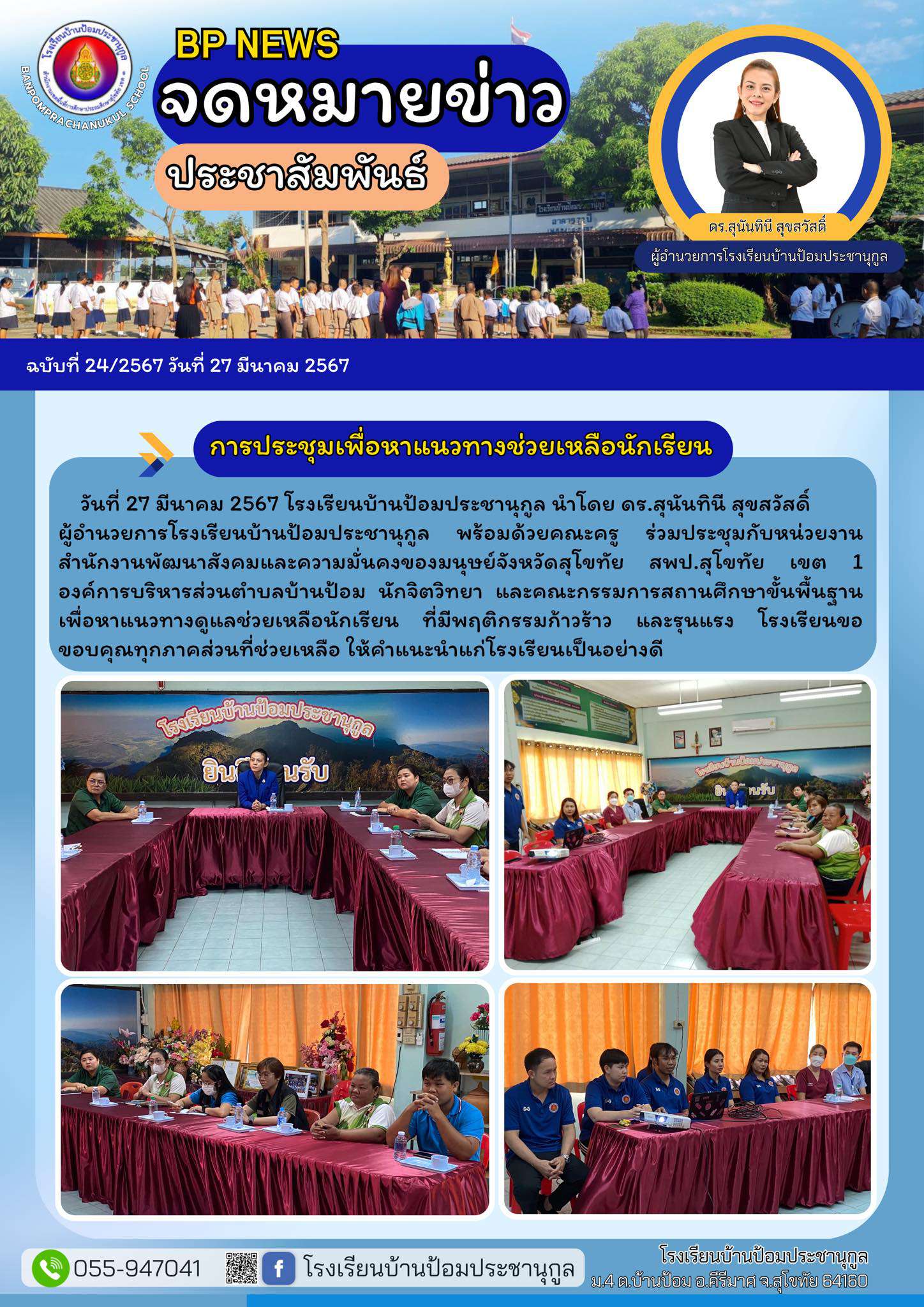 วันที่ 27 มีนาคม 2567 โรงเรียนบ้านป้อมประชานุกูล นำโดย ดร.สุนันทินี สุขสวัสดิ์ ผู้อำนวยการโรงเรียนบ้านป้อมประชานุกูล พร้อมด้วยคณะครู ร่วมประชุมกับหน่วยงานสำนักงานพัฒนาสังคมและความมั่นคงของมนุษย์จังหวัดสุโขทัย สพป.สุโขทัย เขต 1 องค์การบริหารส่วนตำบลบ้านป้อม นักจิตวิทยา และคณะกรรมการสถานศึกษาขั้นพื้นฐานเพื่อหาแนวทางดูแลช่วยเหลือนักเรียน ที่มีพฤติกรรมก้าวร้าว และรุนแรง โรงเรียนขอขอบคุณทุกภาคส่วนที่ช่วยเหลือ ให้คำแนะนำแก่โรงเรียนเป็นอย่างดี
